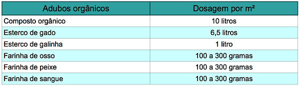 Para saber a quantidade de adubo orgânico a ser utilizada, oriente-se pela tabela, considerando que um balde plástico, destes que se tem em casa, costuma ter capacidade para 20 litros.