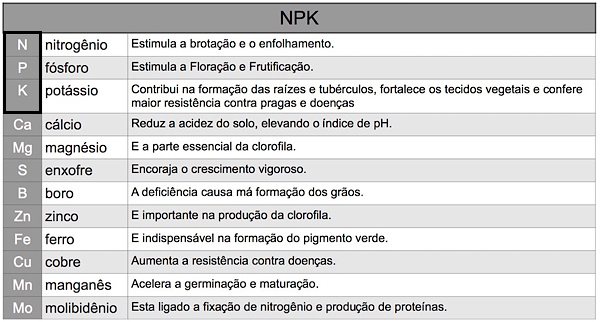Os micronutrientes são consumidos em pequenas quantidades, enquanto que os macronutrientes são consumidos em larga escala e são representados pela sigla NPK.